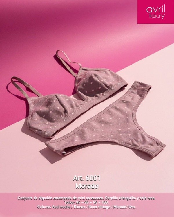 Conjunto de algodón estampado mini corazones. Corpiño triangulito y cola less.